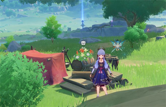 拿到第五个宝箱后,可以继续往南走。会看到一个红色的小帐篷。第六个宝箱就在这个小帐篷旁边。这是来自蒙德传奇冒险家斯坦利的挚友的宝箱,奖励为两万摩拉与两个矿。